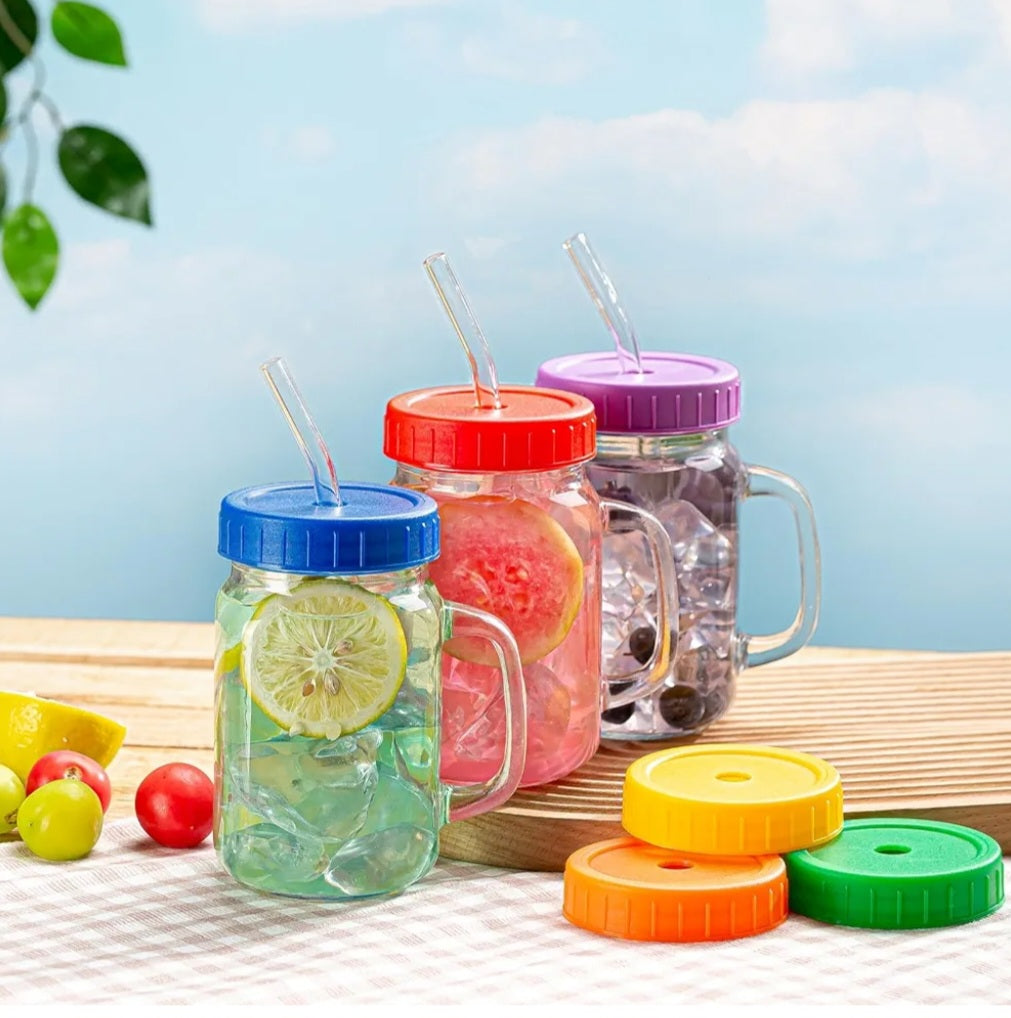 16oz mason jar glass with handle, sealing plastic lid, & glass straw
